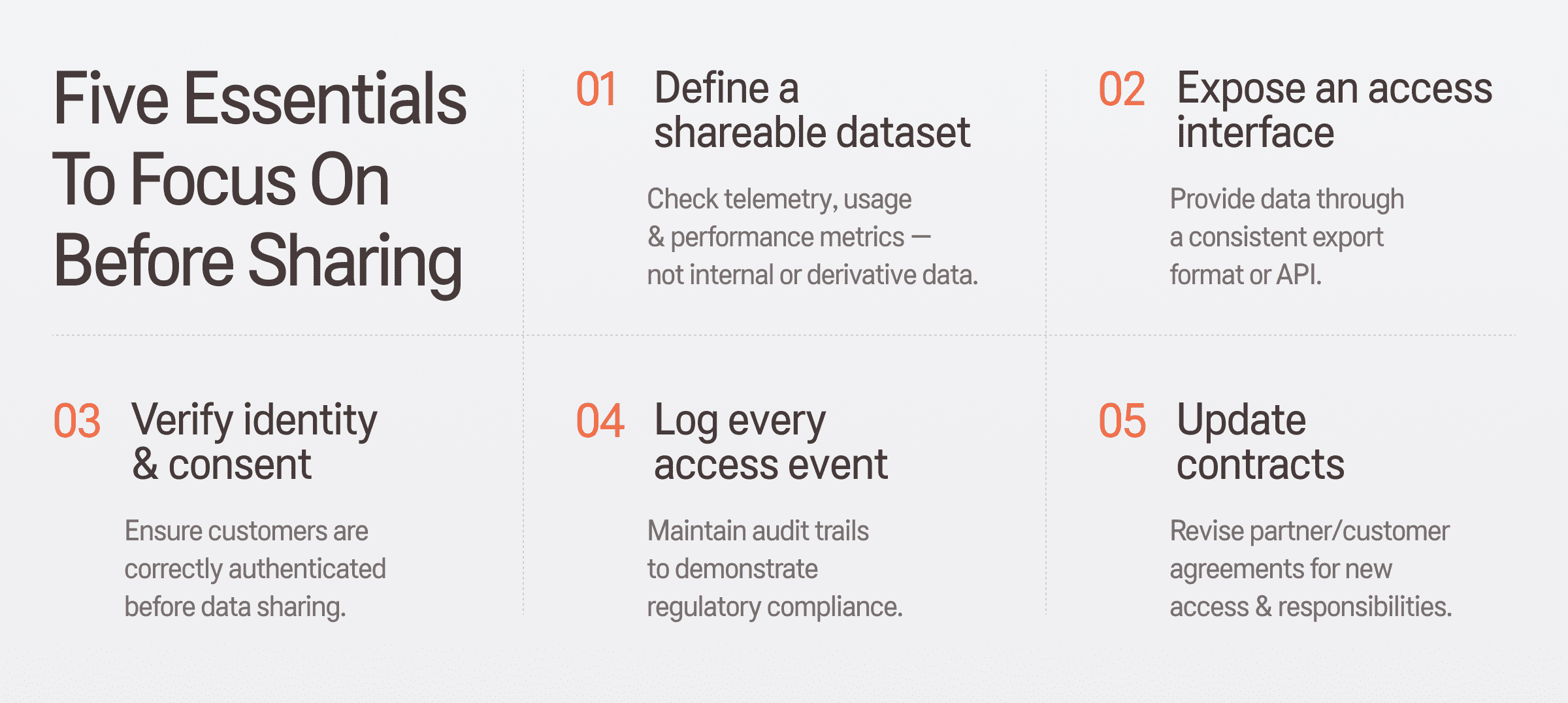 | Prepare to Share | OEMs with connected products, telemetry pipelines, or portals already in place. | Meeting Data Act obligations while building internal readiness and customer trust. | Highly feasible for most OEMs with connected products. Clear path, predictable effort, lowest organizational friction. | – Backlog pressure; – Older product generations slowing rollout; – Customer expectations outpacing initial scope. |