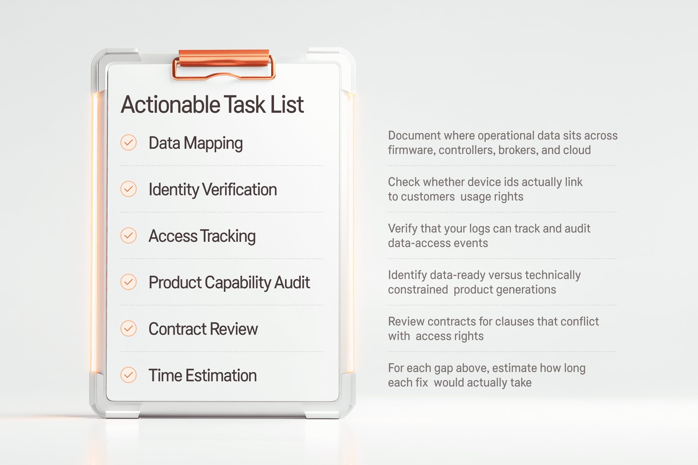 These are the minimum steps required to meet the regulation’s intent. They do not demand a full rebuild, but they require coordination between engineering, legal, and IT.